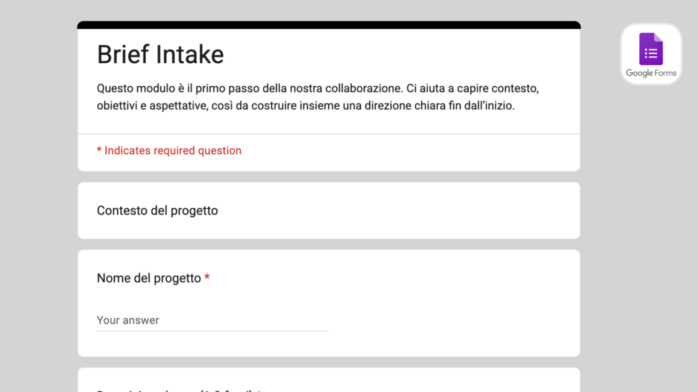 Il Brief Intake Template di Crebs è un modulo pronto all’uso in Google Form, progettato per raccogliere tutte le informazioni chiave dai clienti in modo strutturato e chiaro.