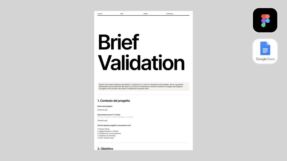 Troppe volte i progetti iniziano senza un allineamento reale: obiettivi poco chiari, aspettative non condivise, criteri di successo vaghi. Il Brief Validation Template di Crebs è pensato per chiudere il cerchio: un documento pronto all’uso in Google Docs e Figma per validare tutte le informazioni raccolte e dare il via al progetto con certezza.